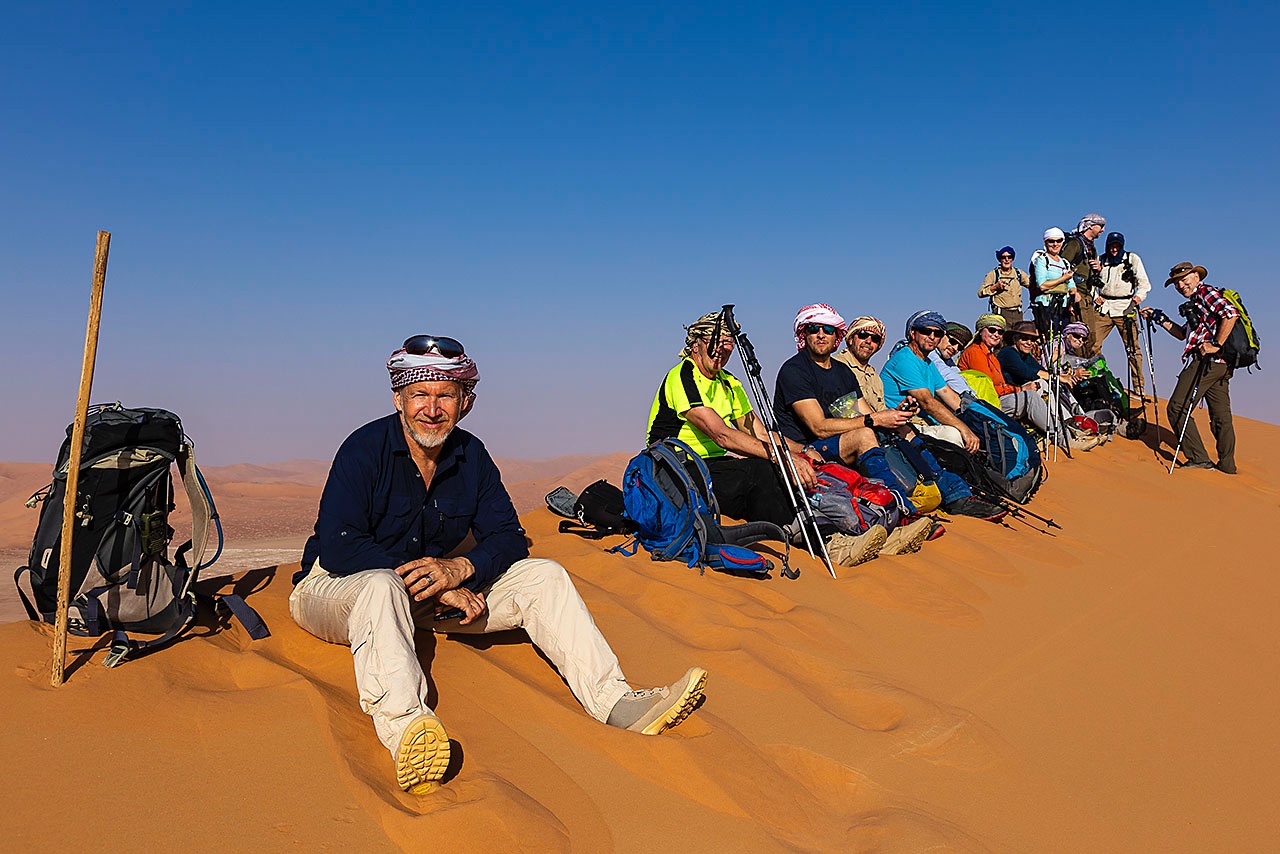 • Jerome Blösser with hiking group resting in the sand dunes, desert landscape, Rub al Khali, Empty Quarter, Dhofar region
