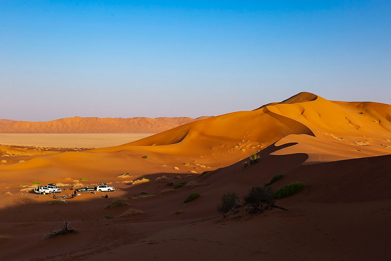 • Campsite in the dunes, desert landscape, Rub al Khali, Empty Quarter, Dhofar region