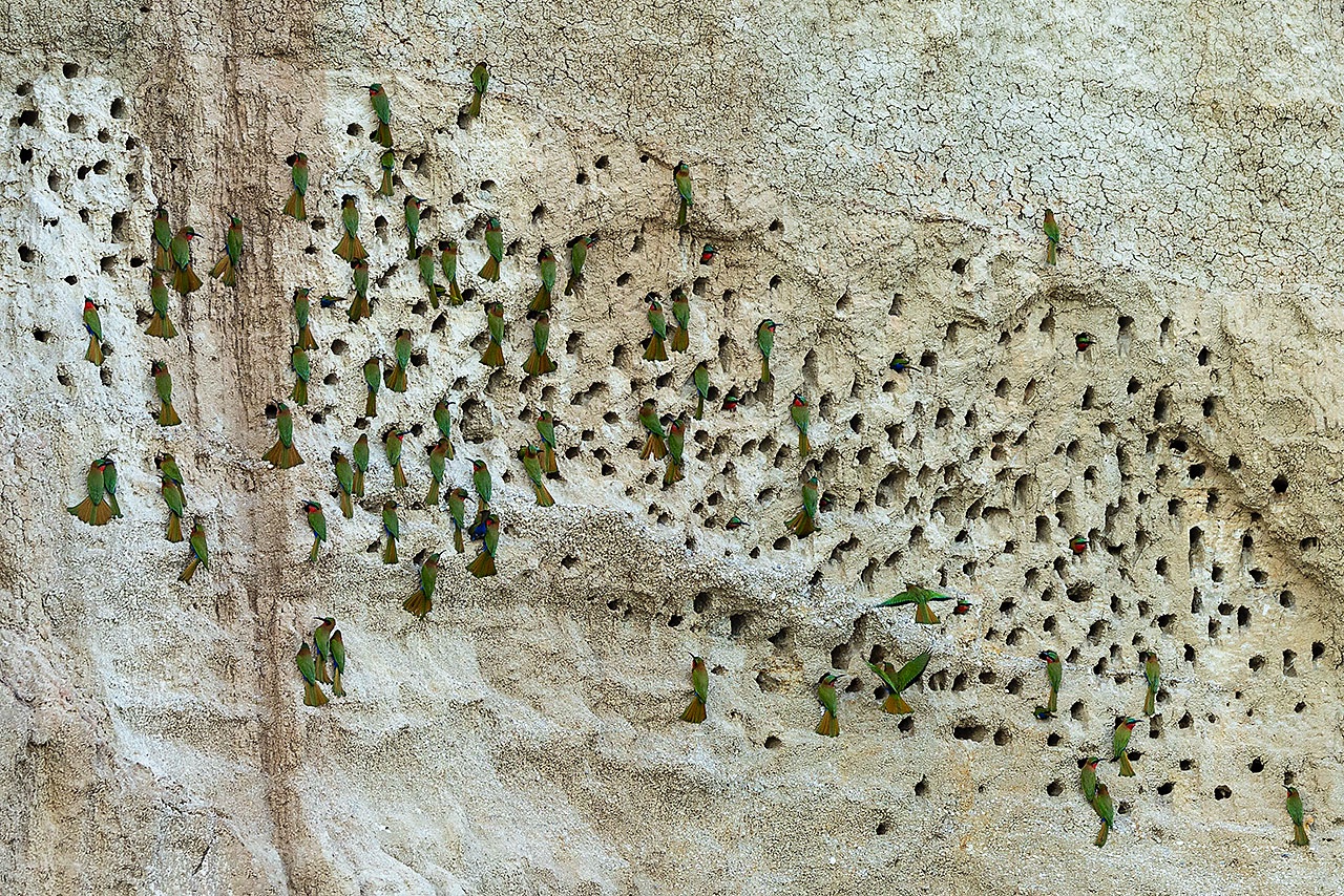 • Colony of Red-throated Bee-eaters in their burrows on a clay wall, Victoria Nile
