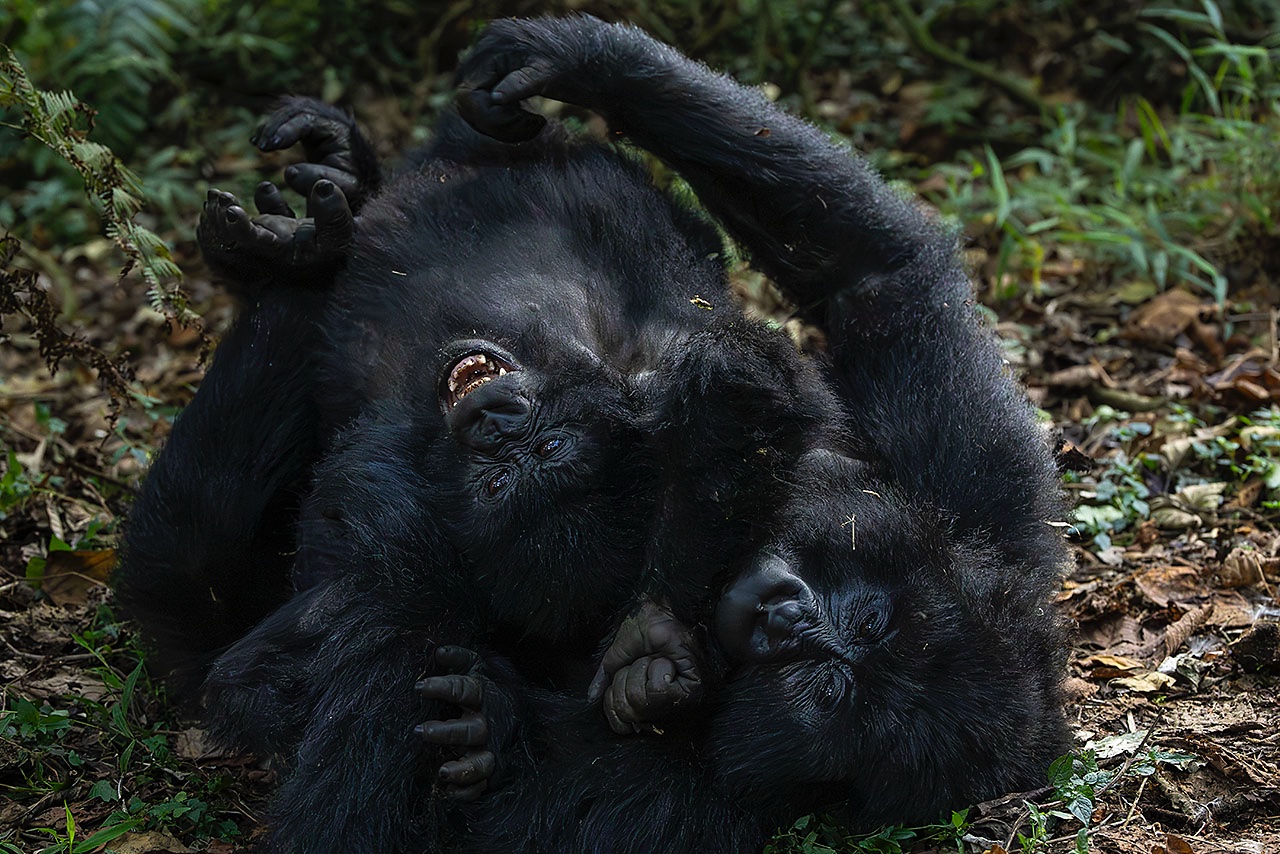 • Young Mountain Gorilla (Gorilla beringei beringei) playing, Nyakagezi Gorilla Group, Mgahinga Gorilla National Park