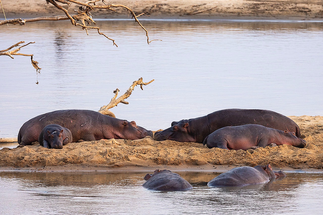 • Resting Hippos (Hippopotamus Amphibius) on a sandbank, South Luangwa National Park