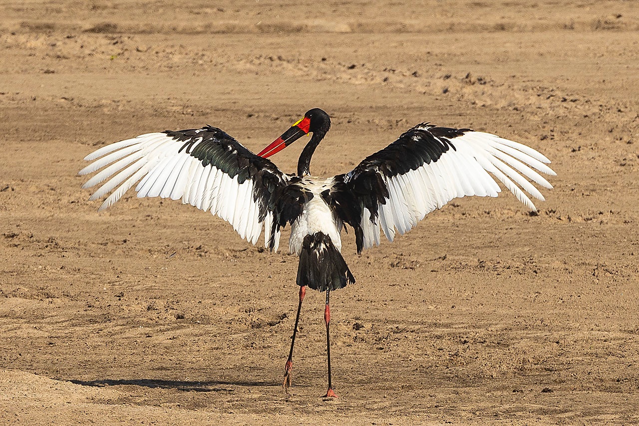• Saddle-billed Stork (Ephippiorhynchus Senegalensis) spreading its wings, South Luangwa National Park