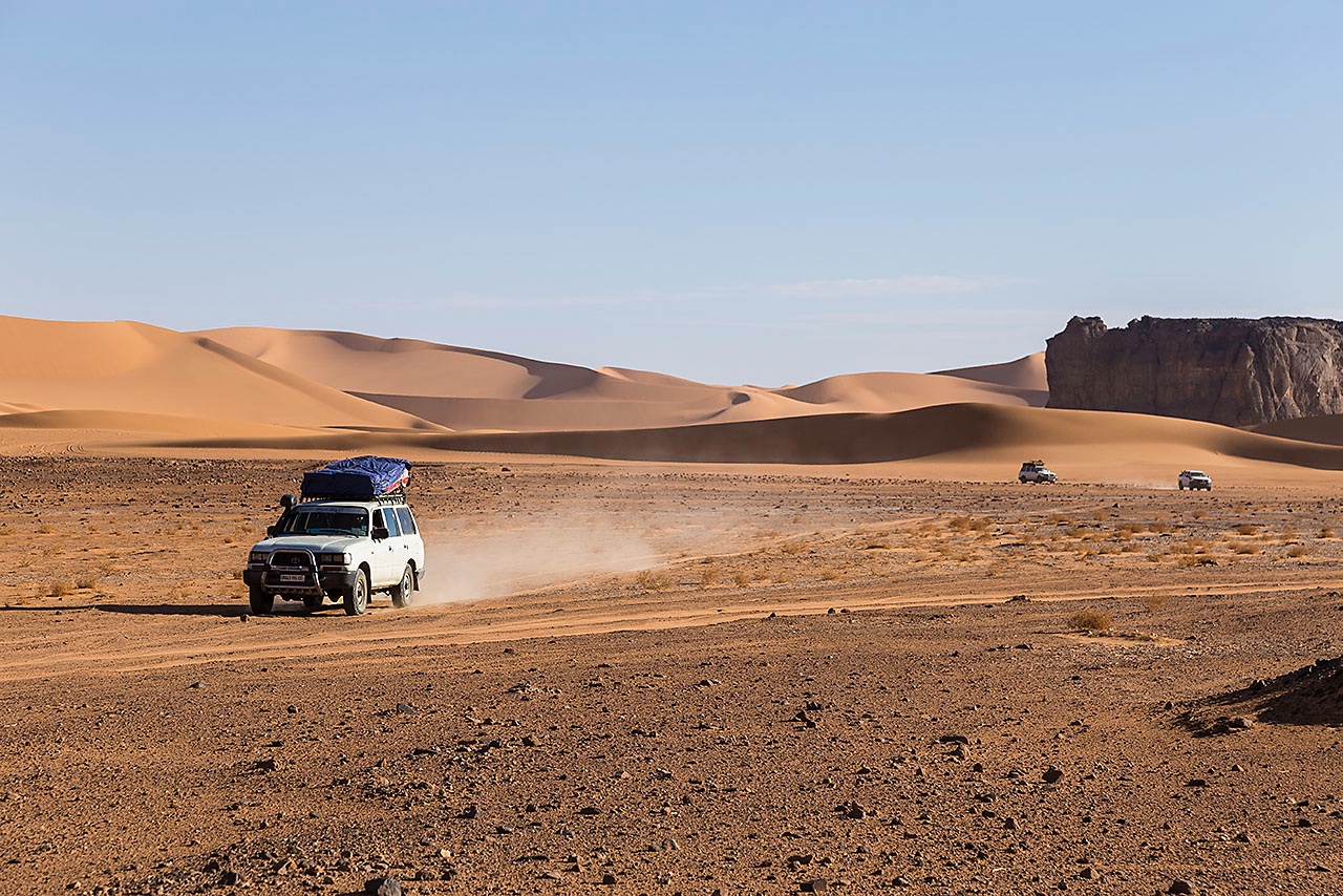 • Four-wheel vehicle near Moul Naga dunes, Tadrart region, Tassili n' Ajjer National Park, Sahara, North Africa
