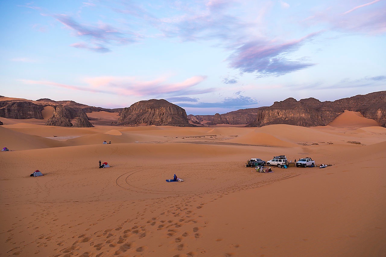 • Campsite in the sand dunes of Moul Naga, Tadrart region, Tassili n' Ajjer National Park, Sahara, North Africa