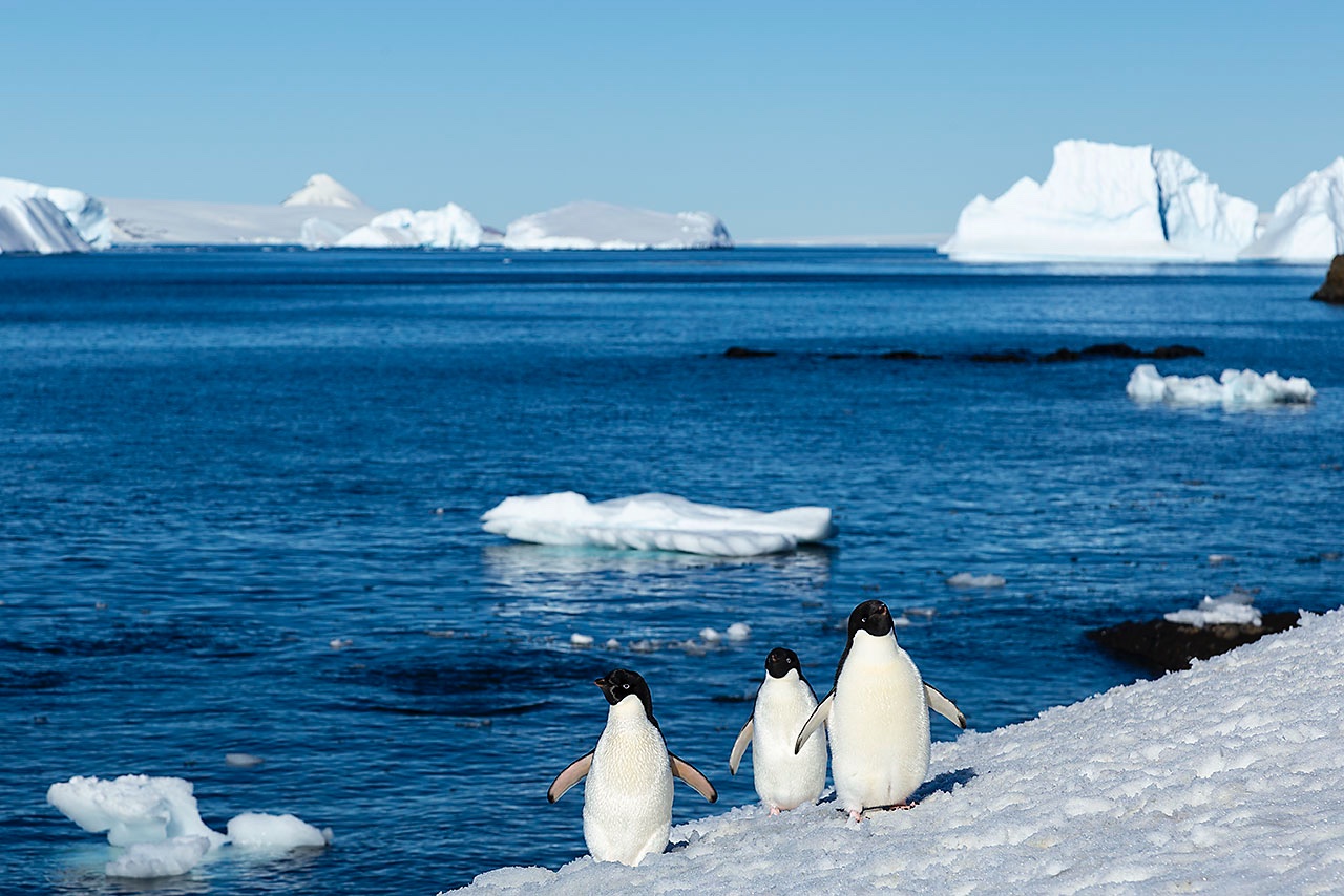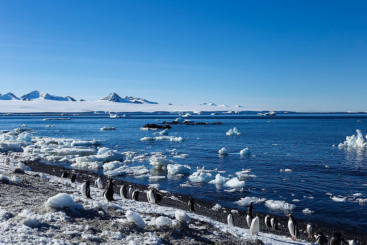 • Approaching Adélie Penguins (Pygoscelis adeliae), Brown Bluff, Tabarin Peninsula