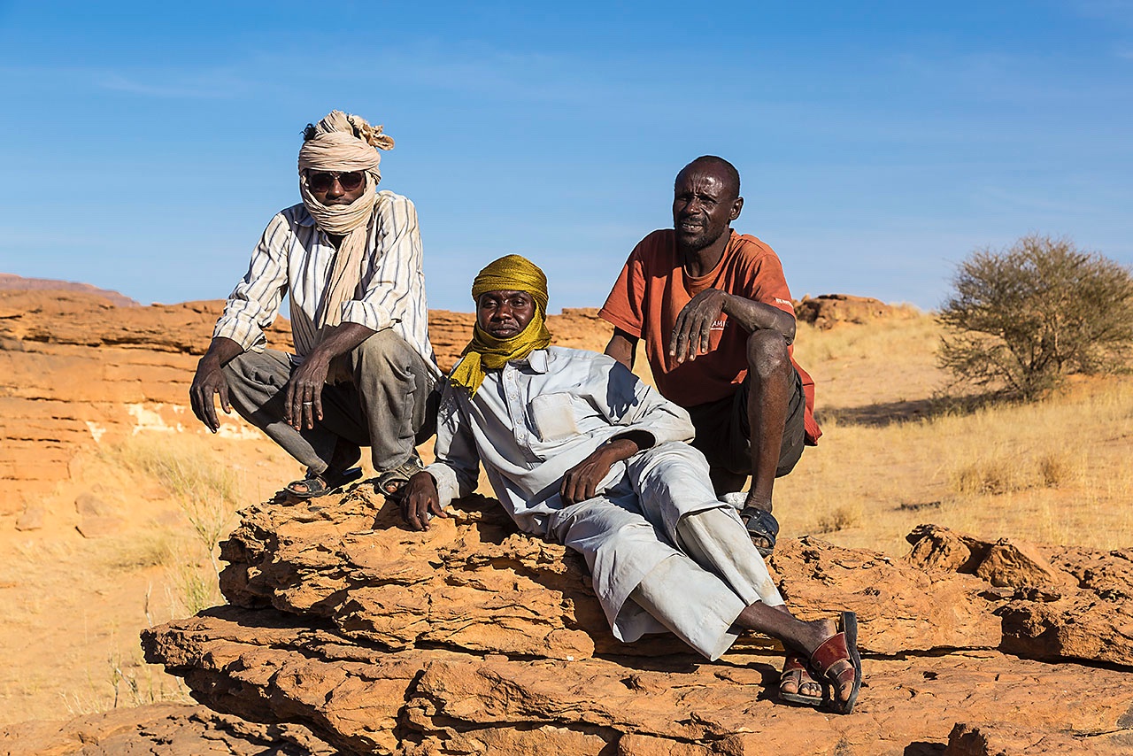 • Driver Mohamed, local guide Haraoun, driver Osman (left to right) taking it easy, Labyrinthe d'Oyo, Ennedi Mountains, northeastern Chad
