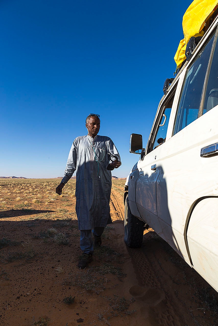 • Local guide Haraoun with mobile phone at Terkei Cave, Ennedi Mountains, northeastern Chad