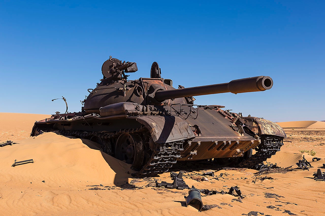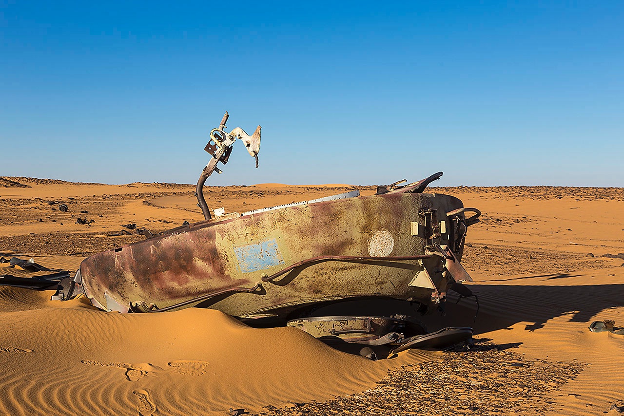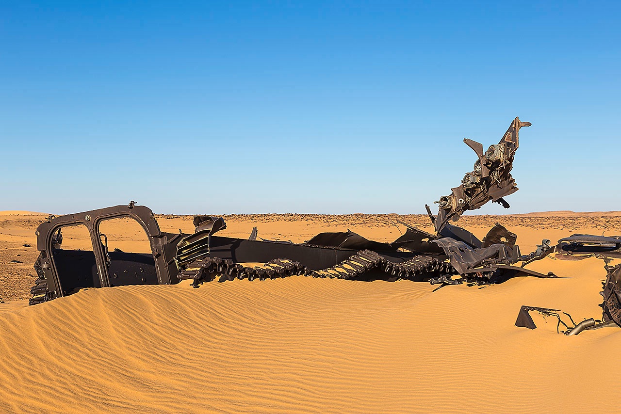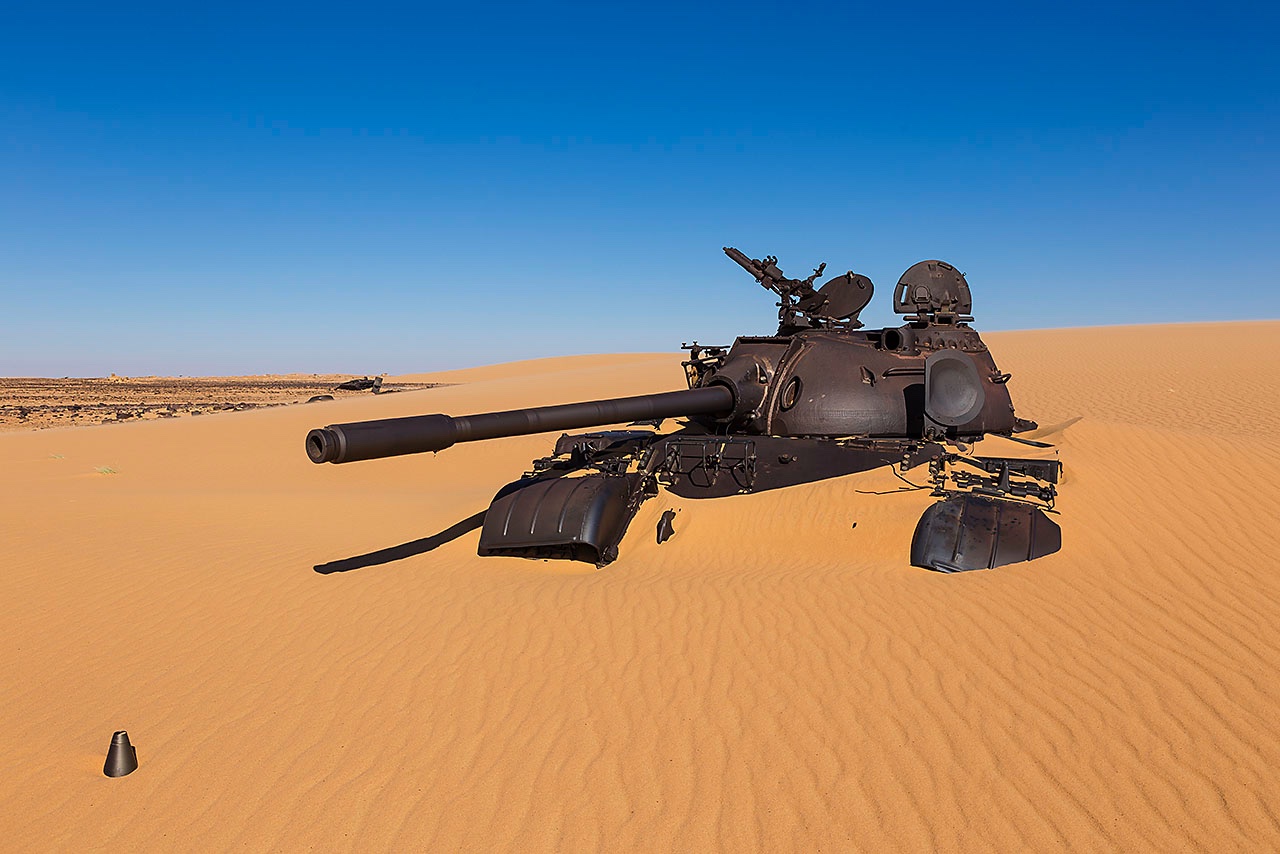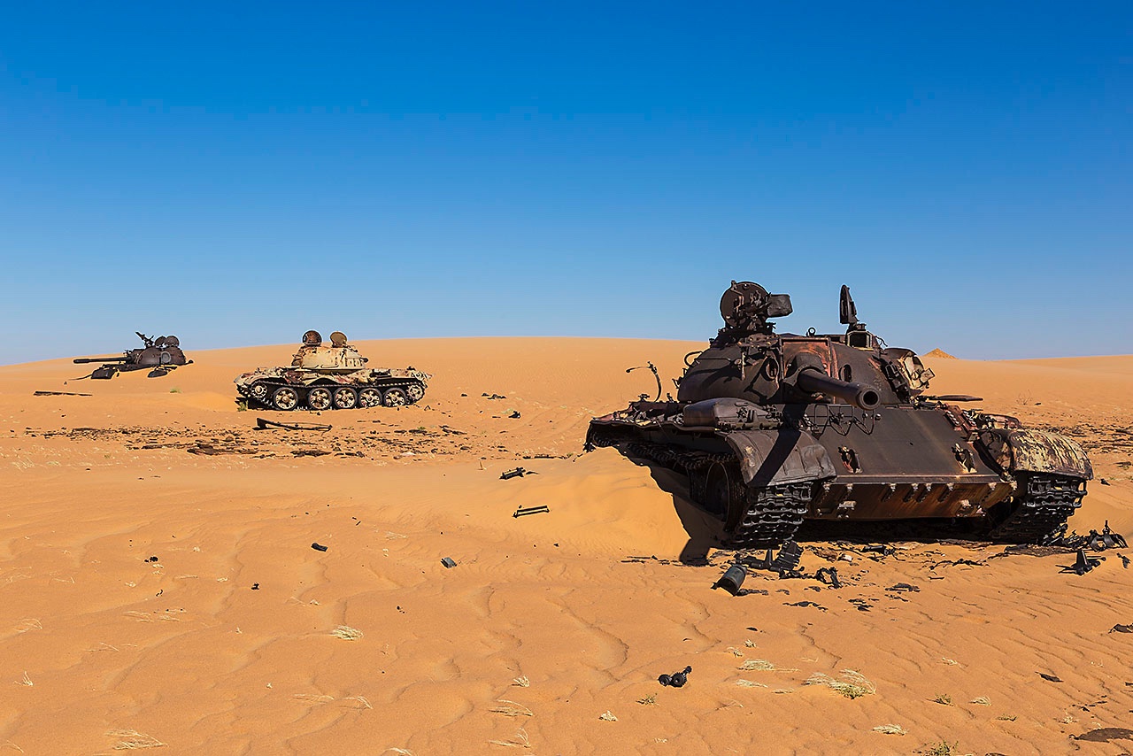 • The remnants of Libyan tanks in the desert sand