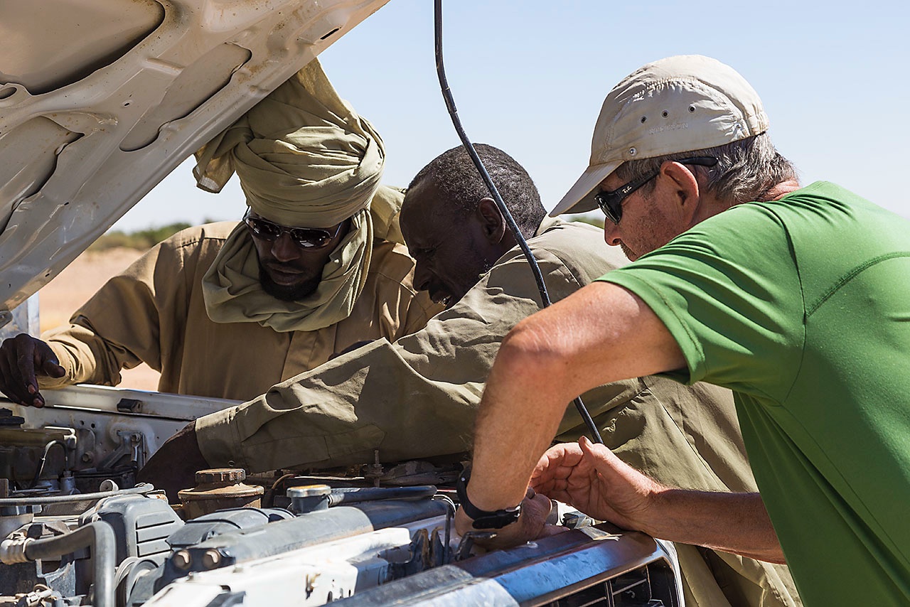 • Our drivers Mohammed and Osman try to get the car running again
