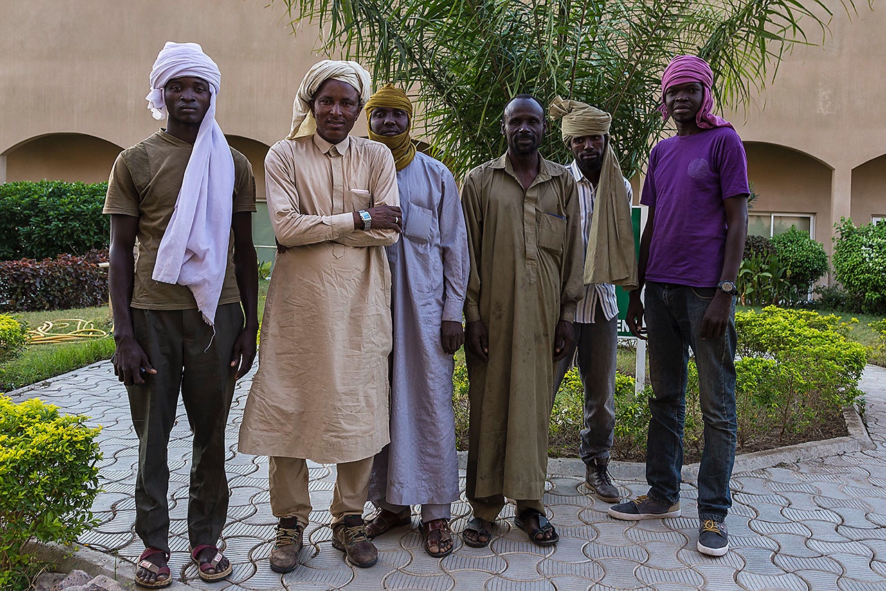 • Cook Nicola, driver Ibrahim, local guide Haraoun, driver Osman, driver Mohammed and translator Moussa (left to right) at our hotel in the capital N'Djamena