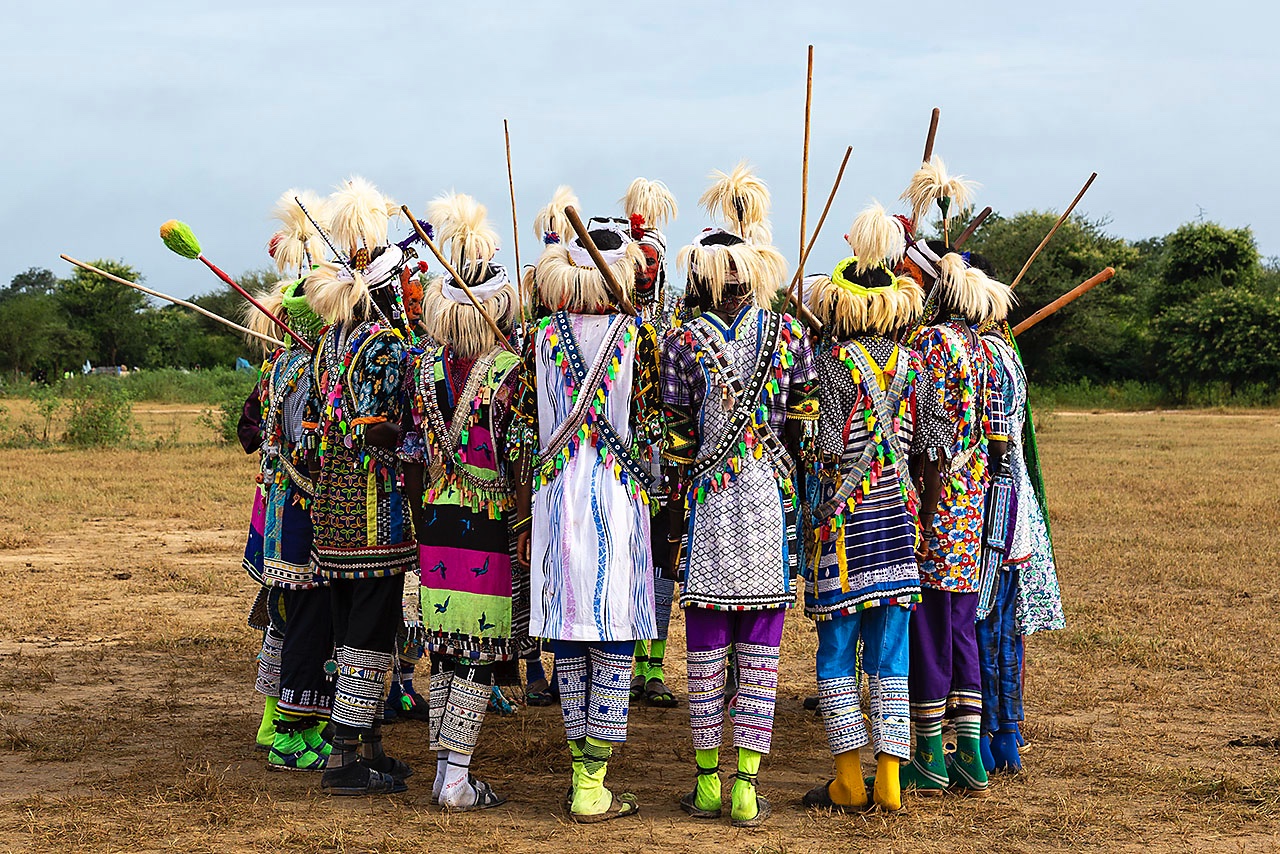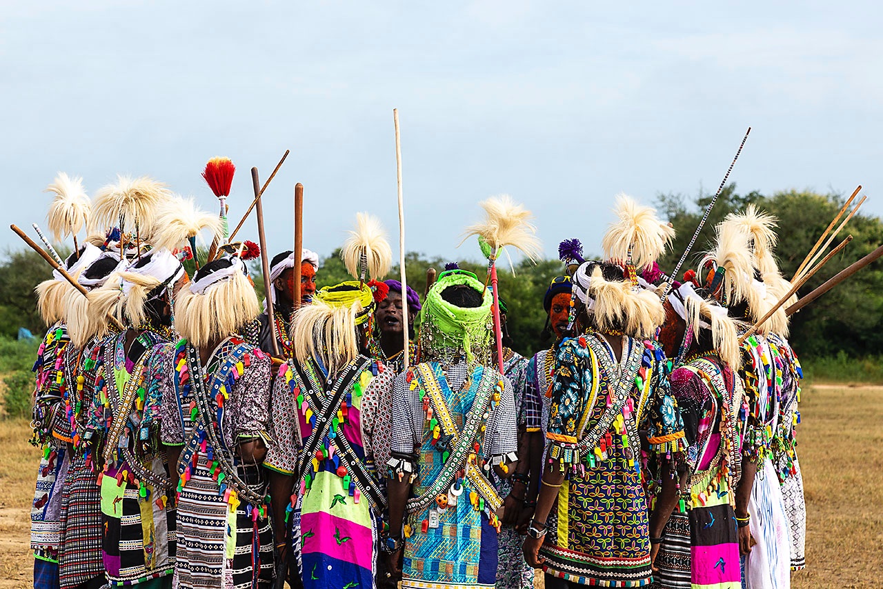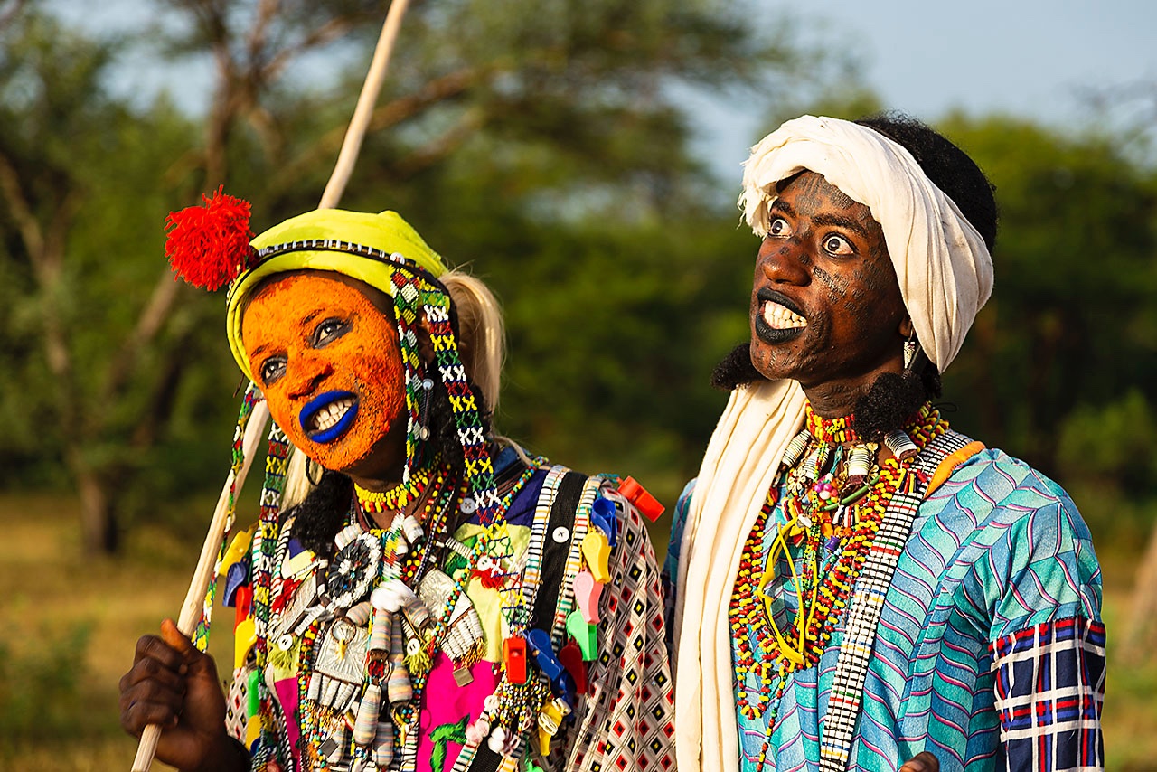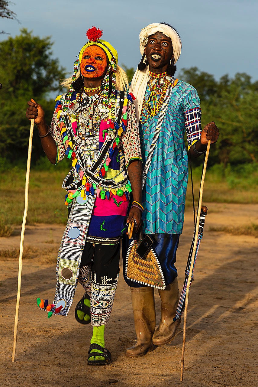 • Wodaabe (Bororo) men's outfits at the Gerewol festival are vibrantly decorated, embellished with beads, feathers, buttons or even whistles in the brightest of colours