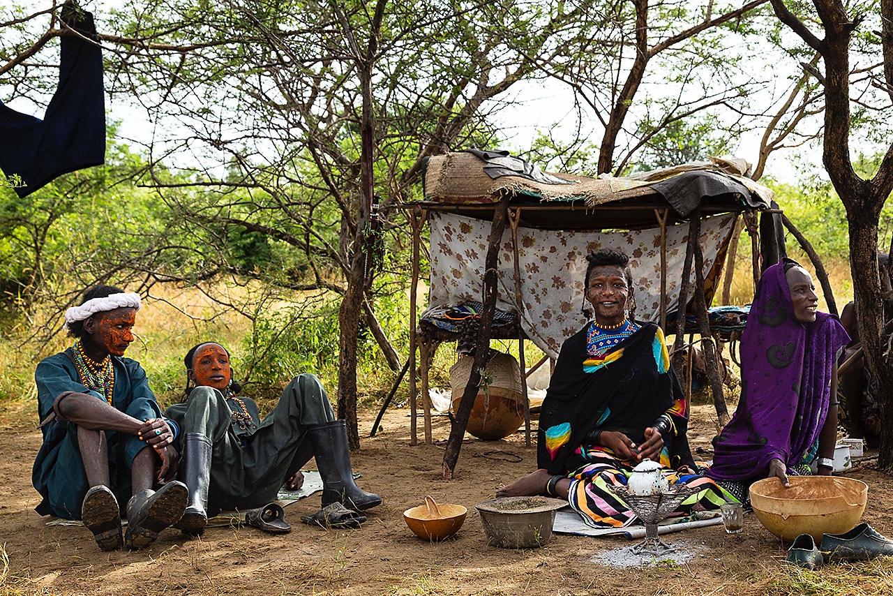 • Wodaabe (Bororo) women preparing tea at small camp or wuro that was set up for the Gerewol festival
