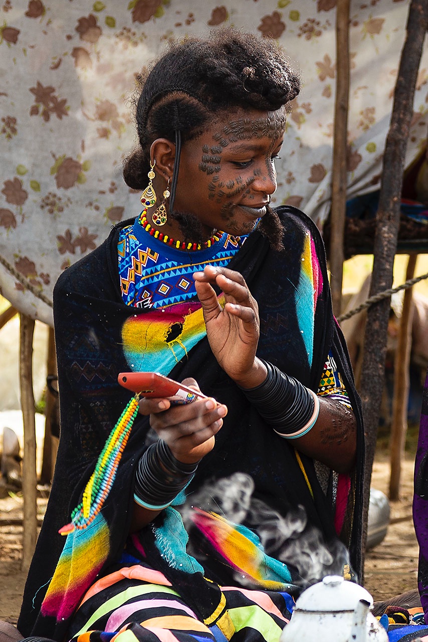 • Wodaabe (Bororo) woman with mobile phone at campsite, Gerewol festival