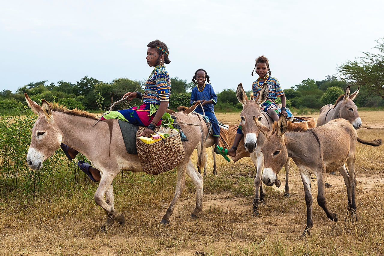 • Wodaabe (Bororo) girls on donkeys leave the Gerewol festival campsite