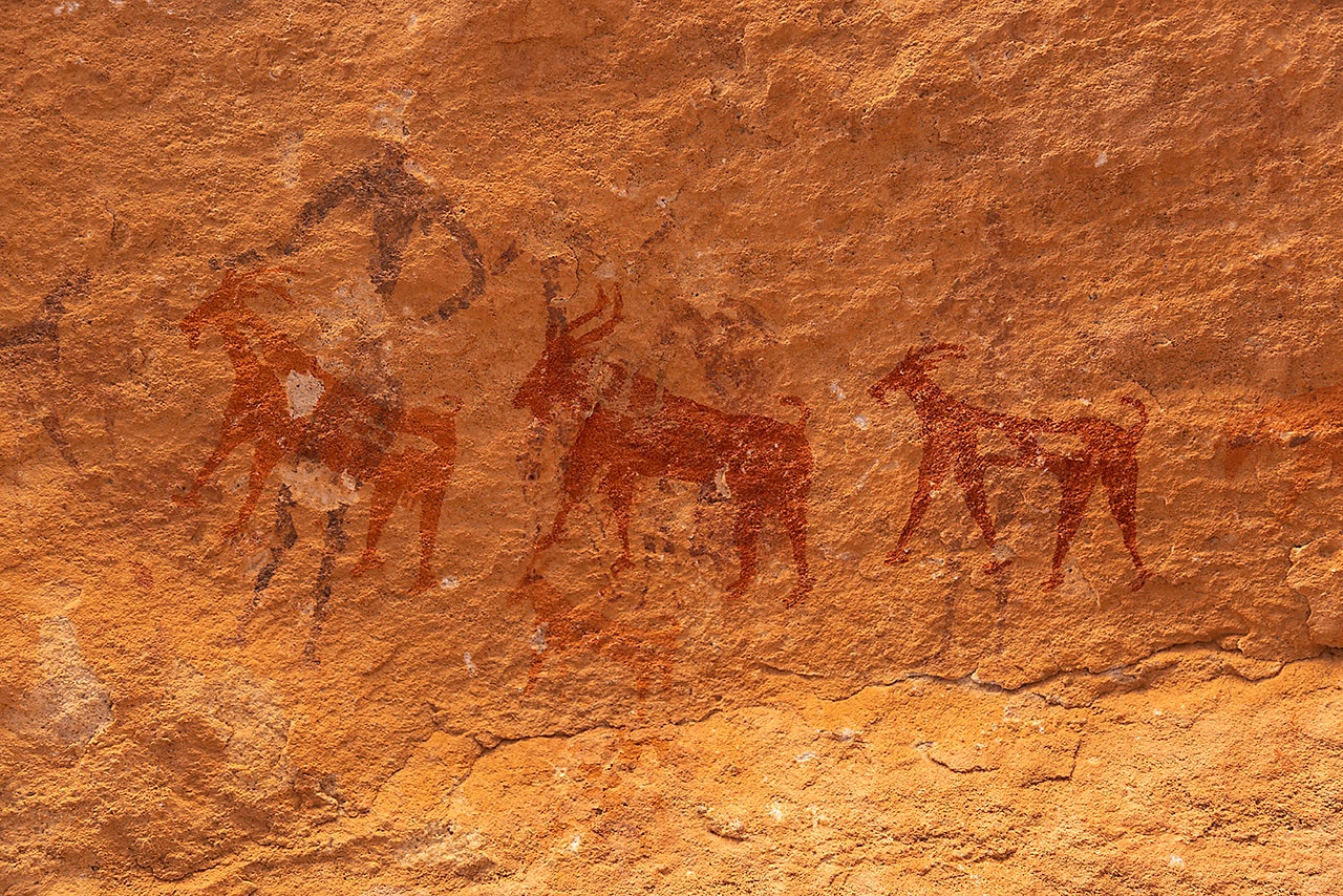• Rock painting depicting cows and bulls, goats, a camel, and a human figure (upper left) with white dots throughout his body, Kozen rock art site, Tibesti region
