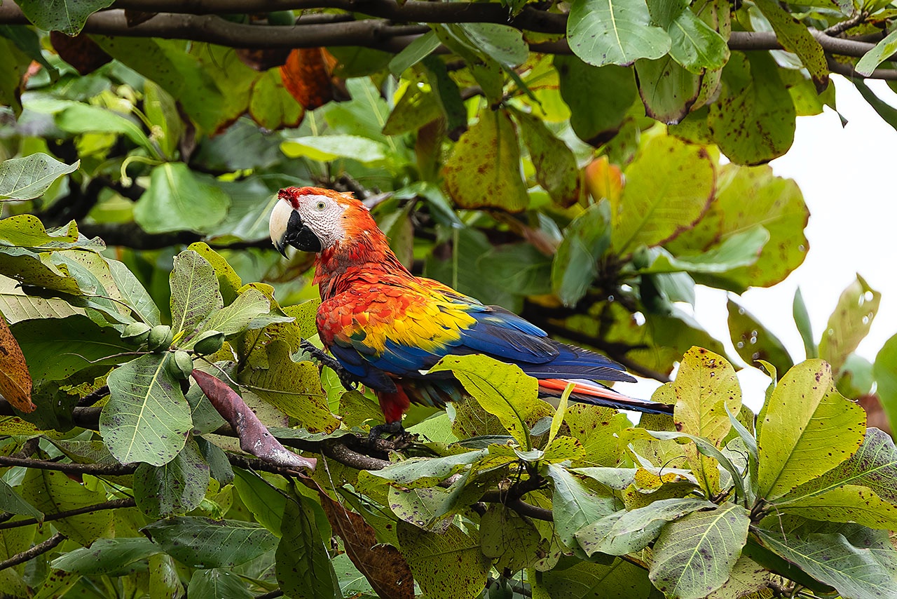 • Scarlet Macaw (Ara macao) sits in a beach almond tree, Carate, Osa Peninsula, Puntarenas Province