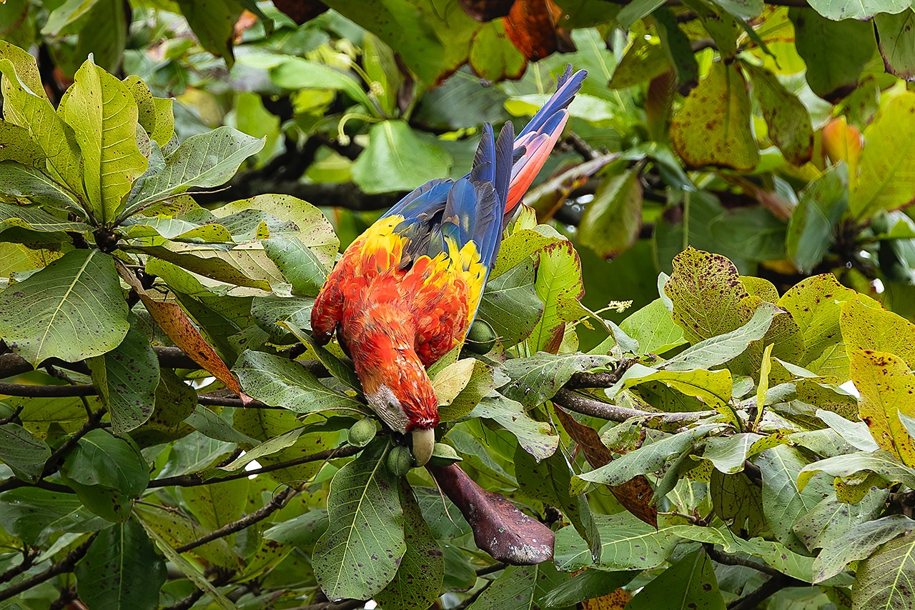 • Scarlet Macaw (Ara macao) reaches for almond tree seeds, Carate, Osa Peninsula, Puntarenas Province
