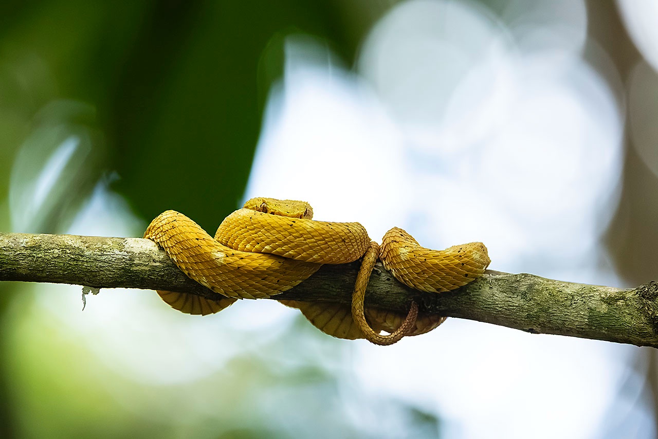 • Bright yellow Eyelash Palm-Pitviper (Bothriechis schlegelii), also known by its colloquial name 'Oropel' (meaning 'golden skin'), Cahuita National Park, Limón Province