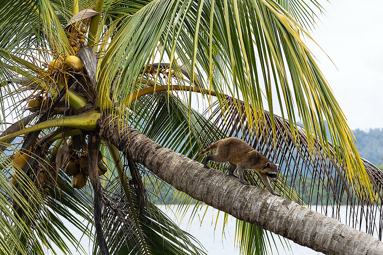• Northern Raccoon (Procyon lotor) climbing down a coconut tree, Cahuita National Park, Limón Province
