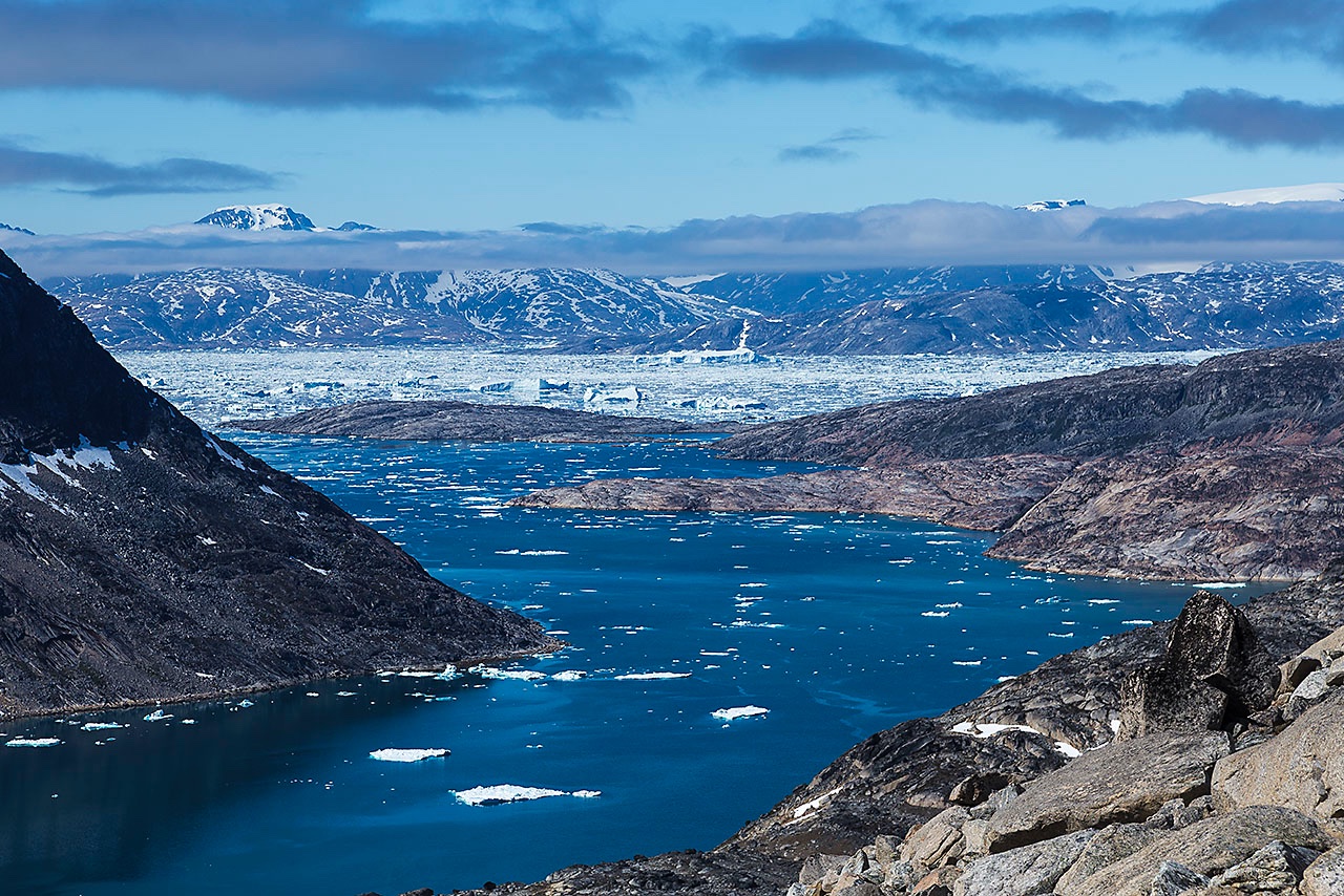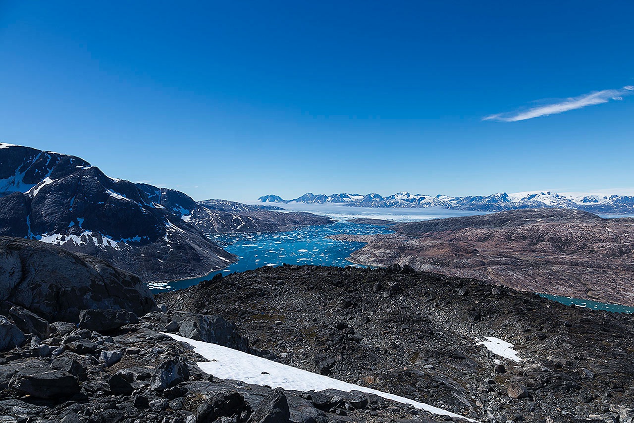 • View of Ikaasartivaq Strait, Sermilik Fjord is visible in the distance