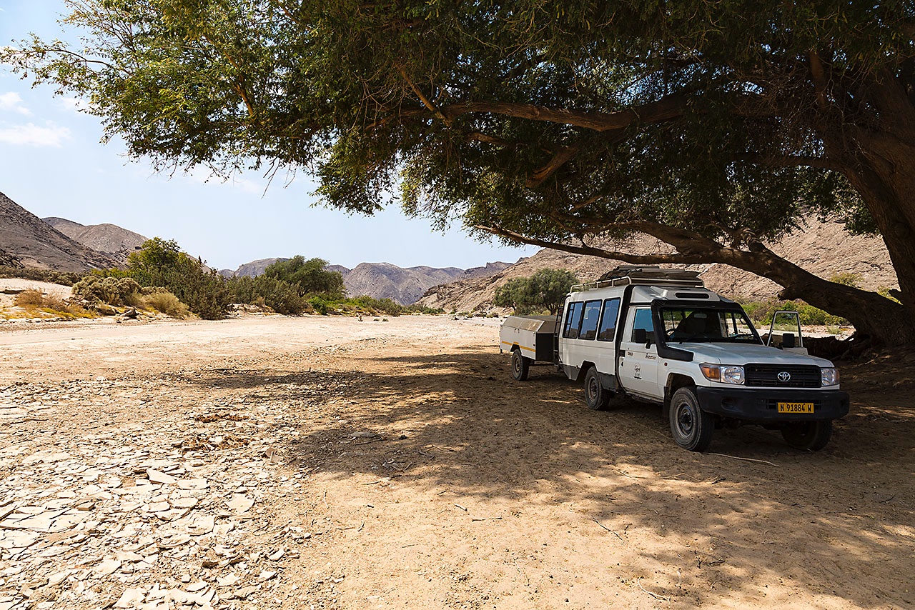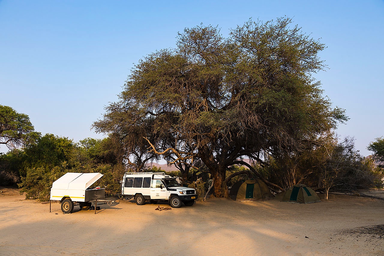 • Camelthorn trees provide shade at Purros Community Campsite, located on the banks of the Hoarusib River, Kaokoland