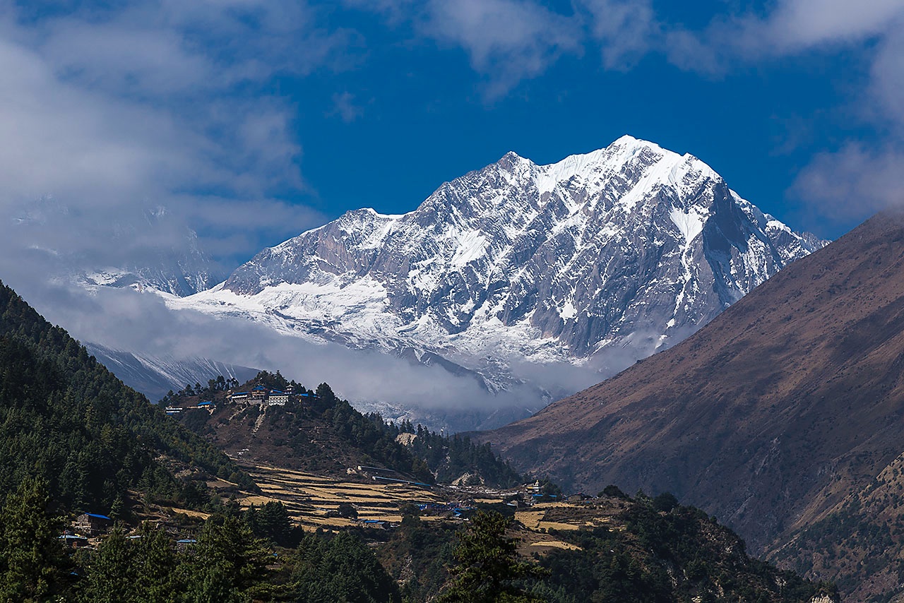 • Manaslu, 8163m, and Gompa, seen from Lho village in the Buri Gandaki Valley