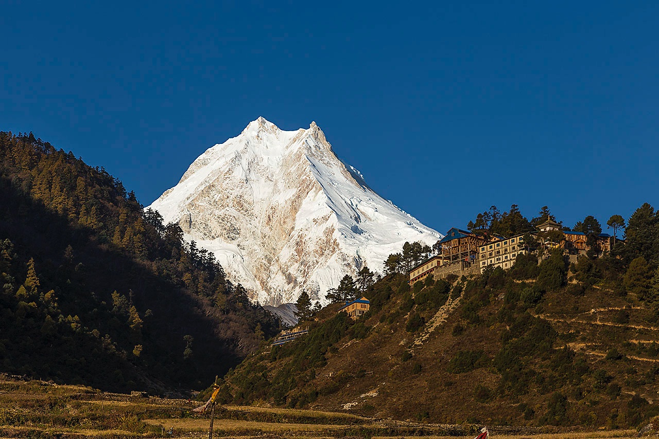 • Manaslu, 8163m, Naike Peak, 6211m, and Gompa, seen from Lho village in the Buri Gandaki Valley