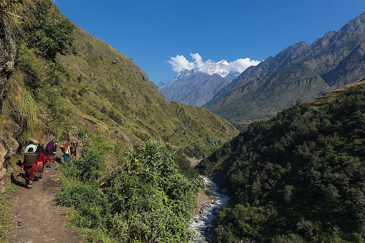 • Trail alongside the Buri Gandaki river with Sringi Himal, 7161m, to the north