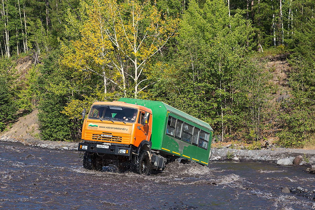 • Kamaz crossing a river on route to the Tolbachik volcano, located 570 km north of Petropavlovsk-Kamchatsky