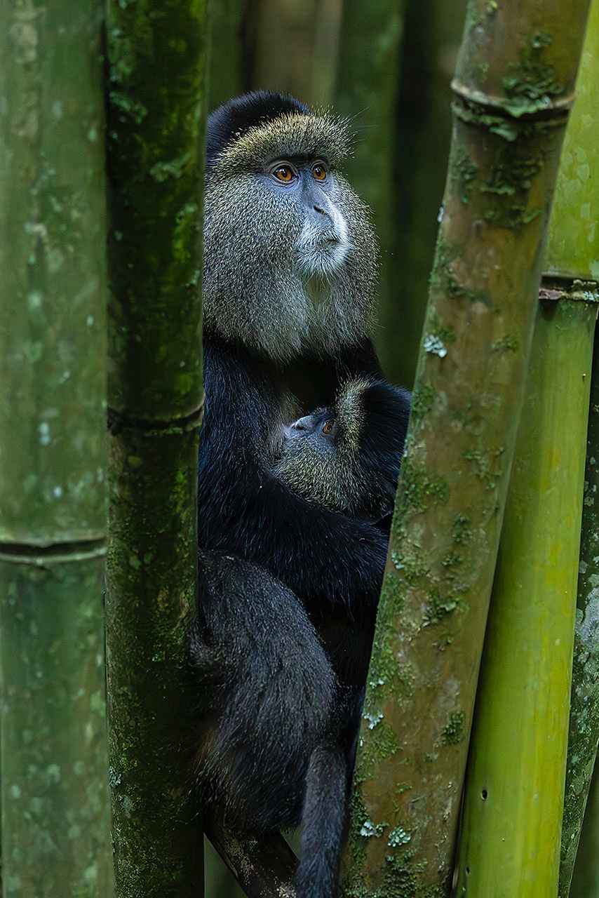 • Golden Monkey (Cercopithecus mitis kandti), mother and child, bamboo forest, Mgahinga Gorilla National Park