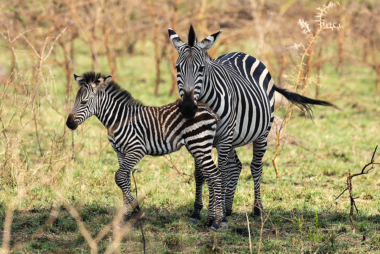 • Burchell's Zebra (Equus quagga burchellii), mother and foal, Lake Mburo National Park