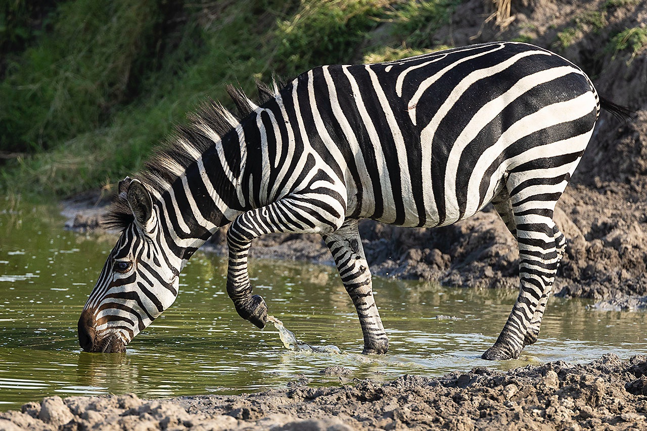 • Burchell's Zebra (Equus quagga burchellii) drinking at a waterhole, Lake Mburo National Park