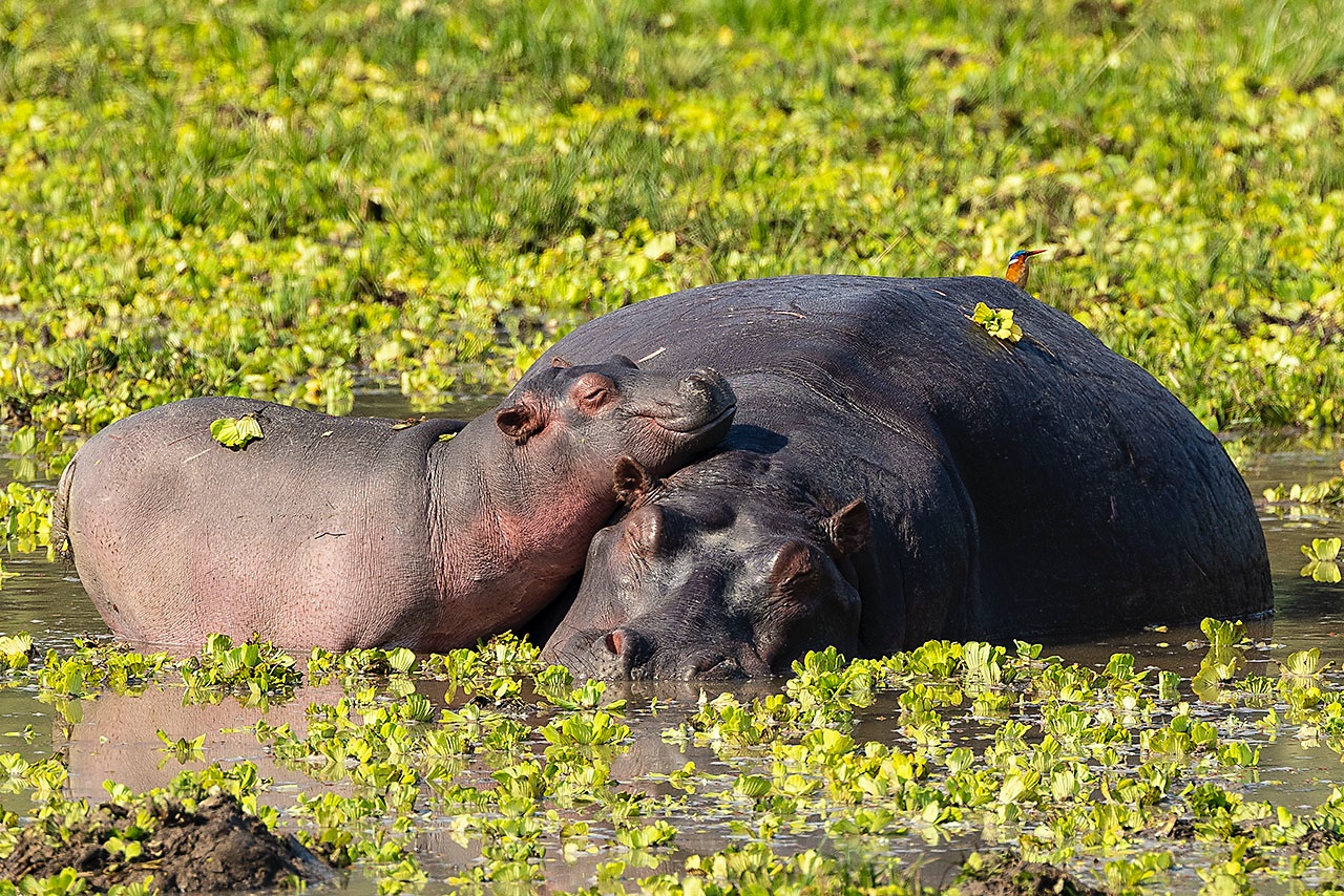 • Resting Hippo (Hippopotamus amphibius) with calf, Malachite Kingfisher (Corythornis cristatus) sitting on top, South Luangwa National Park